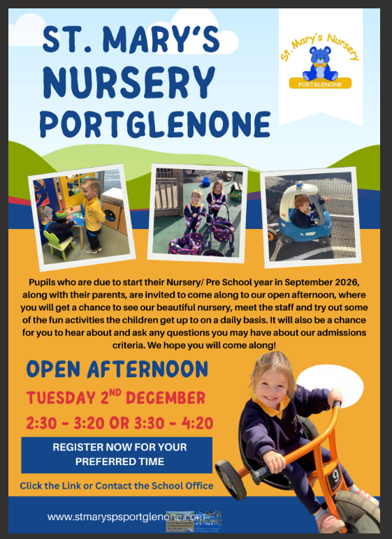 See below dates and information pertaining to our open events. If you know of any families who have children of nursery/ primary school age next September please feel free to share this information with them.