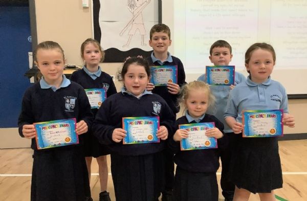 Well done to our most recent Principal Award Winners. You may have noticed that on our new School Vision Mural we have many school values listed around the edge. These values were decided by our School Council from last school year. The idea is that we want these values to encompass all that we do in St Mary's. Every two weeks we choose a new school value and new recipients in each class will be chosen. Well done to those children who have stood out for showing kindness.