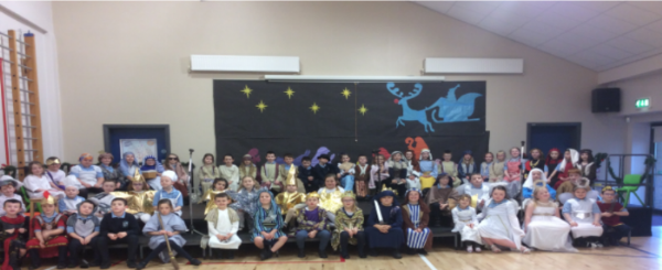 On Wednesday 11th December we performed our Christmas show for our mums and dads and family. We had been rehearsing for weeks and we had put a lot of hard work in to the show. Our show was called ‘Bethlehem the Musical’ and it told the story of how baby Jesus was born. I (Aoife) was Ben the Musician and I entertained everybody on their way to Bethlehem with lots of singing and I (Eimear) was an innkeeper and I was trying to make some money from the people visiting Bethlehem. Niamh Smith was the chairperson, Naoisha was Mary and Caitlin was a bread seller. We also had shepherds, angels, stars, soldiers, a posh lady and a posh man. We all had really important roles to play to make our show work. We had lots of songs and dance routines to learn but our favourite one was ‘Hospitality’ because it gets faster and faster and that meant we had to dance faster and faster and it was really good fun to learn. Our family all said that we were amazing and our teachers were so proud of us.