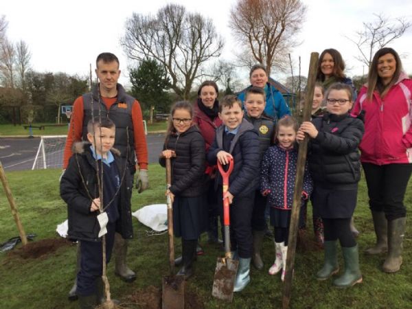 On Wednesday 5th February Rachel Conway, from the Butterfly Conservation Society and some volunteers helped members of our eco-committee to plant some fruit trees at the rear of the school. Therese’s daddy, Damien also helped the pupils to dig the holes for the trees. We planted a variety of apple trees and our first plum tree. Hopefully it won’t be too long before we see fruit on the trees
