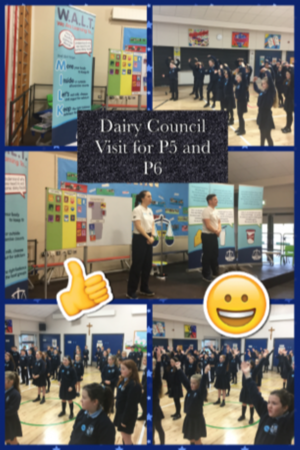 Today the Dairy council visited us and P6. Their names were Luke and Majella. At the start they gave us stickers which said cheese, milk or yoghurt, I got cheese. They told us about how we can stay fit and eat lots of food. They showed us names of the five food categories. They also showed us this song that was a rap. Two teams had a rap-off and tied 2-2. They then showed us a song with the words `Yoghurt Milk and Cheese`. It was like YMCA but without the A. Then they pulled out a balancing scale. We had to see much exercise we need to be equal with how much we eat to be healthy. We need an hour or so exercise every day so they pulled out a big clock to see how much exercise we do every day. It was really fun playing, singing and dancing with them and I hope they come again and hopefully they talk about how they usually exercise and keep fit. I loved when they visited it was really fun. If they do visit again I hope they talk about animals on dairy farms like cows and chickens, it would be really fun learning about them at the Dairy farm.