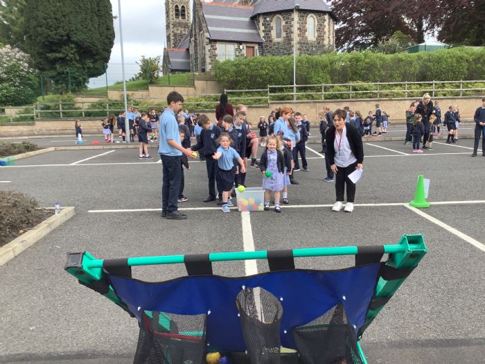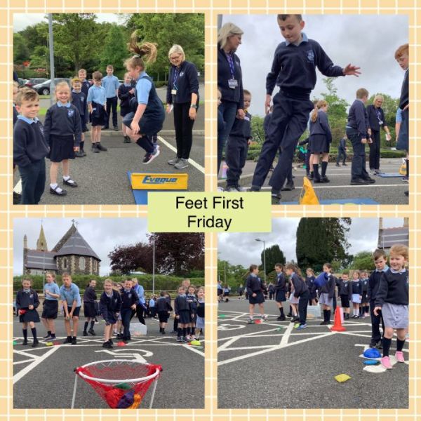 On Friday the 20th of May the whole school, from Nursery to Primary 7, took part in Feet First Friday as part of Sustrans activities to help us be active, healthy and happy. All the pupils and adults went outside to the carpark (where there were no cars) for a selection of fun and active activities. Each class was split up and put into a group .In total there were 11 groups with pupils from every class and 11 games and stations.The stations were water relay, beanbag toss, dance, skipping, stilts, penalty shootouts, hula hoop pass through, stepping stone walk,shape ball throw, speed-bounce and lastly REST. We worked our way through all the stations in our group and had a great time. We really hope we will do it again next year!