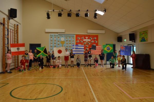 Sports day this year was on Wednesday the 25th of May. Our whole school was organised into teams. Each team was made up of children from P1—P7, with the P7 children being the captains. We picked a country that was taking part in the Olympics this summer to be our team name. We then had to wear the colours of that country. We made flags to represent our country and had an opening ceremony before the events started! We had lots of cheers from our parents as we walked up!!! It was great.