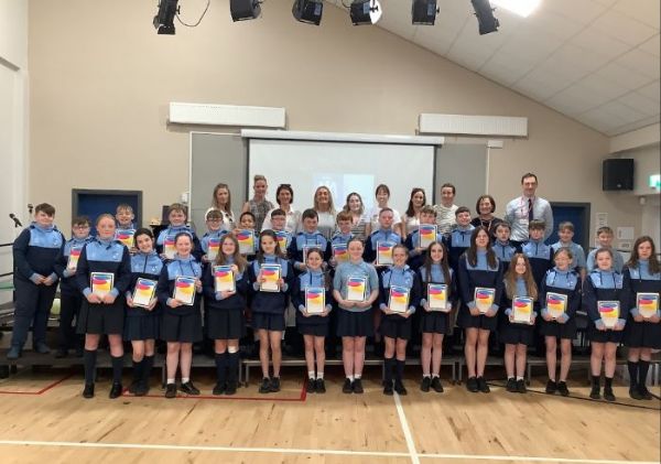 Also pictured are the two Primary 7 winners of two £50 Outfield vouchers also kindly